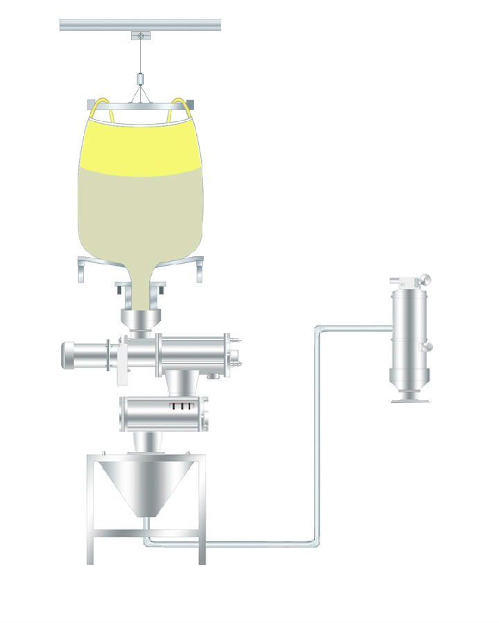 說明:此種吸料方式是由下往上吸料,拆包機(jī)下部出口需加裝補氣裝置。